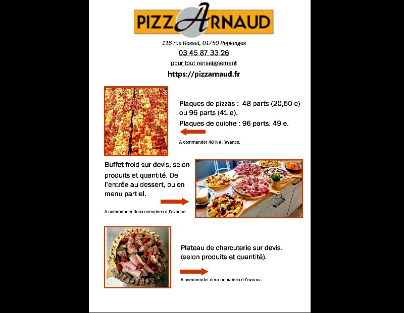 Vous pouvez commander des plaques de pizzas, des quiches ou d'autres prestations traiteur.